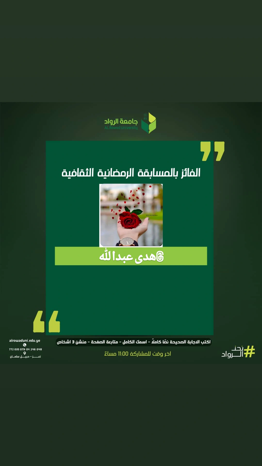 🌙🏆 إعلان الفائز – اليوم السادس 🏆🌙 ضمن أجواء مسابقة رمضان الثقافية، نُعلن اليوم عن الفائز الثاني بالجائزة اليومية 🎉 💰 قيمة الجائزة: 20,000 ريال 🎉 ألف مبروك للفائز: هدى عبدالله نتمنى له دوام التوفيق والنجاح 🌟 وسيتم التواصل معه عبر الرسائل الخاصة لاستكمال إجراءات استلام الجائزة. 🔔 تابعونا يومياً… الفرصة مستمرة، واسمك قد يكون في الإعلان القادم! #رمضان_مع_جامعة_الرواد #المسابقة_الرمضانية #جامعة_الرواد #نحن_الرواد.