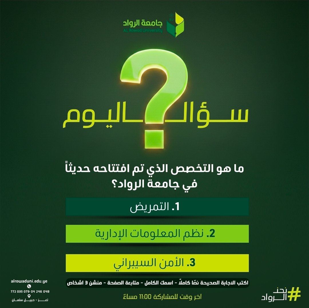 🌙📚 مسابقة رمضان الثقافية – اليوم السادس ✨ سؤال اليوم: ما هو التخصص الذي تم افتتاحه حديثاً في جامعة الرواد؟ 1️⃣ التمريض 2️⃣ نظم المعلومات الإدارية 3️⃣ الأمن السيبراني ✍️ اكتب إجابتك نصاً كاملاً في التعليقات وادخل السحب على: 💰 جائزة 20,000 ريال 📌 شروط المشاركة: ✔️ عمل إعجاب ومتابعة لصفحة الجامعة ✔️ كتابة الإجابة نصاً كاملاً ✔️ الإشارة إلى (3) من الأصدقاء ✔️ مشاركة المنشور على صفحتك الشخصية (وضع عام) ⏰ آخر موعد للمشاركة: الساعة 11:00 مساءً 📢 إعلان الفائز في منشور الغد 🔥 شارك الآن ولا تفوّت فرصتك… يمكن يكون اسمك هو القادم! #رمضان_مع_جامعة_الرواد #المسابقة_الرمضانية #جامعة_الرواد #نحن_الرواد https://www.facebook.com/share/p/15d9rnW9XBr/.