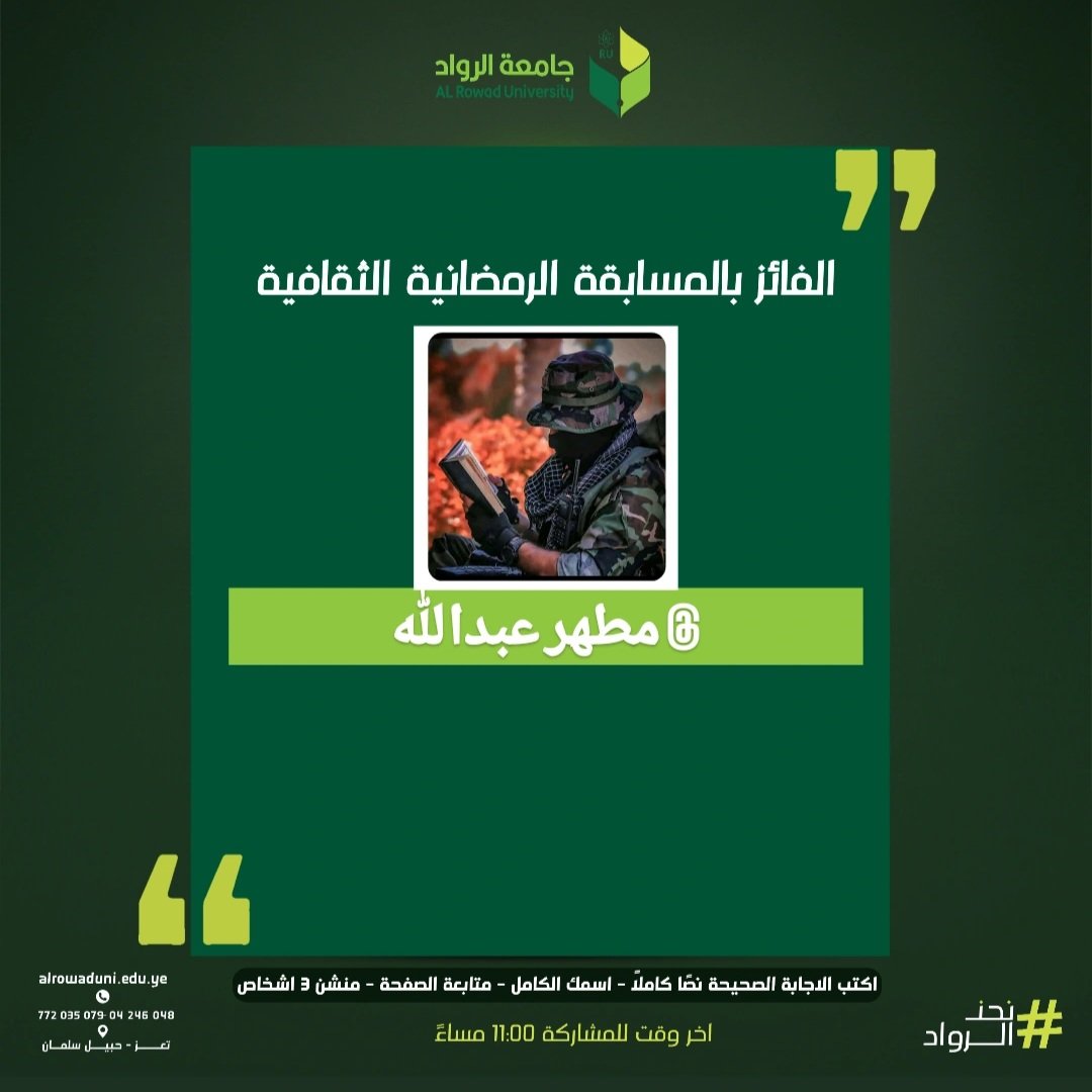 🌙🏆 إعلان الفائز – اليوم الرابع 🏆🌙 تواصل مسابقة رمضان الثقافية أجواءها المميزة، ويسعدنا أن نعلن عن فائز اليوم الرابع 🎉✨ 💰 قيمة الجائزة: 20,000 ريال 👏 نبارك للفائز مطهر عبدالله ونتمنى له دوام التوفيق والنجاح. وسيتم التواصل معه عبر الرسائل الخاصة لاستلام الجائزة. 🔔 تابعوا المسابقة يومياً… الفرصة ما زالت مستمرة، وقد يكون اسمك في الإعلان القادم! #رمضان_مع_جامعة_الرواد #المسابقة_الرمضانية #جامعة_الرواد #نحن_الرواد.