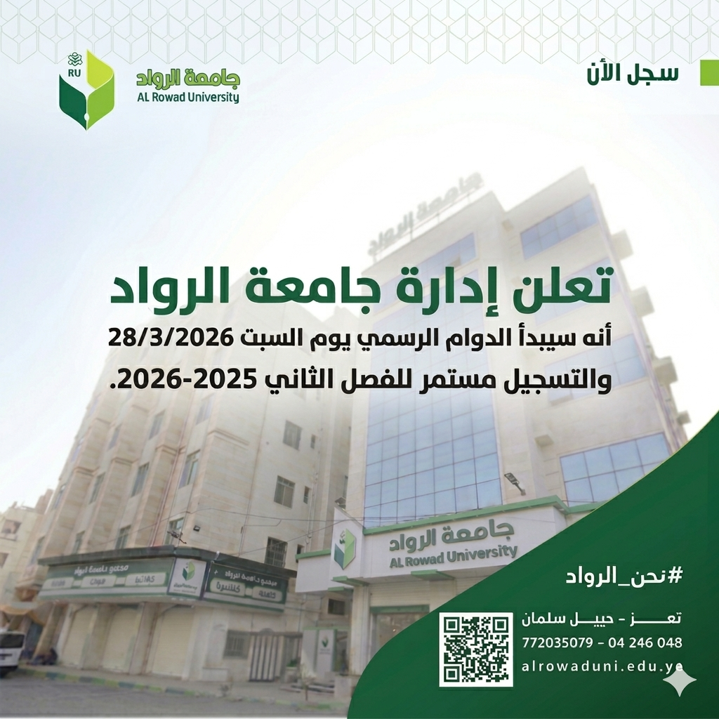 تعلن إدارة جامعة الرواد عن استئناف الدوام الرسمي: 🗓 الموعد: السبت القادم 28 مارس 2026 ✨ التسجيل مستمر: للفصل الدراسي الثاني 2025-2026. اجعل عودة الدراسة بداية لتحقيق أحلامك.. مقعدك بانتظارك! 💪 📍 تعز - حبيل سلمان 📞 للتواصل: 772035079 – 04 246 048 #نحن_الرواد #جامعة_الرواد.
