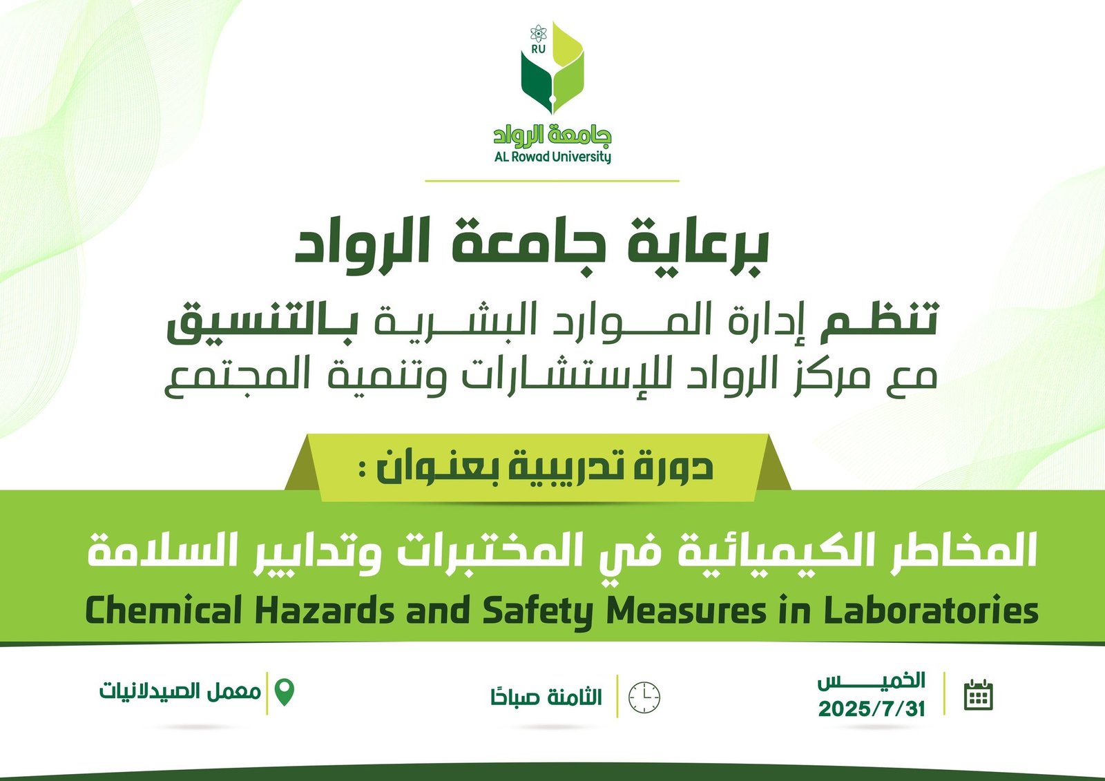 برعاية جامعة الرواد.. نظمت إدارة الموارد البشرية بالتنسيق مع مركز الرواد للاستشارات وتنمية المجتمع دورة تدريبية بعنوان: "المخاطر الكيميائية في المختبرات وتدابير السلامة" الخميس 31 يوليو 2025م شارك في الدورة معيدي قسم طب وجراحة الفم والأسنان وفنيي المعامل، وهدفت إلى رفع مستوى الوعي بالإجراءات الآمنة في بيئة المختبرات، وكيفية التعامل مع المواد الكيميائية الخطرة. قدّم الدورة الأستاذ الدكتور أحمد الكمالي، وتناول فيها أبرز المخاطر المحتملة داخل المختبرات، وأهم وسائل الحماية والتعامل السليم مع الحوادث الطارئة. تأتي هذه الدورة ضمن جهود الجامعة المستمرة في تأهيل وتطوير الكوادر الأكاديمية والفنية، وتعزيز بيئة عمل آمنة في مختلف المرافق التعليمية. جامعة الرواد #نحن_الرواد .