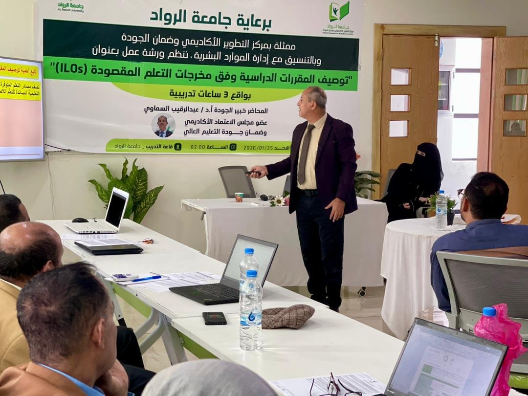 جامعة الرواد تُدشن مرحلة التميز الأكاديمي بورشة نوعية لتوصيف المقررات وفق معايير الجودة جامعة الرواد - الدائرة الإعلامية في خطوة استراتيجية نحو تعزيز جودة التعليم وتحقيق الريادة الأكاديمية، نظّم مركز التطوير الأكاديمي وضمان الجودة بالتنسيق مع إدارة الموارد البشرية بجامعة الرواد، يوم أمس الأحد الموافق 25 يناير 2026م، ورشة عمل تخصصية بعنوان: "توصيف المقررات الدراسية وفق مخرجات التعلم المقصودة (ILOs)"، والتي أدارها الخبير الأكاديمي الأستاذ الدكتور/ عبدالرقيب السماوي، عضو مجلس الاعتماد الأكاديمي. افتتحت الورشة الدكتورة/ عائدة عبدالملك الشامي، عميدة الشؤون الأكاديمية ومديرة المركز، بكلمة أكدت فيها أن هذه الورشة تمثل "التدشين الفعلي للمرحلة الثانية من نظام الجودة الداخلي للجامعة"، مشيرةً إلى أن الهدف ليس مجرد تعبئة قوالب ورقية، بل هو إعادة هندسة العقول وبناء مناهج قادرة على تخريج كوادر تنافس في سوق العمل المحلي والدولي. شهدت الورشة تفاعلاً كبيراً من قبل الأساتذة العمداء ورؤساء الأقسام وأعضاء هيئة التدريس، حيث استعرض أ.د/ عبدالرقيب السماوي خارطة طريق دقيقة لتحويل الأهداف التعليمية إلى مخرجات ملموسة (معارف، مهارات، وكفايات)، مع التركيز على استراتيجيات التدريس الحديثة وأساليب التقييم التي تضمن ردم الفجوة بين التنظير الأكاديمي والتطبيق المهني. يأتي تنظيم هذه الفعالية ضمن سلسلة من التحركات التي يقودها مركز التطوير الأكاديمي وضمان الجودة بالجامعة لاستكمال توصيف كافة البرامج الأكاديمية للعام الجامعي 2025-2026م، بما ينسجم مع الخطة الاستراتيجية للجامعة الرامية للحصول على الاعتماد الأكاديمي المؤسسي والبرامجي. جامعة الرواد.. نبني العقول.. بصناعة المناهج. #جامعة_الرواد #نحن_الرواد .