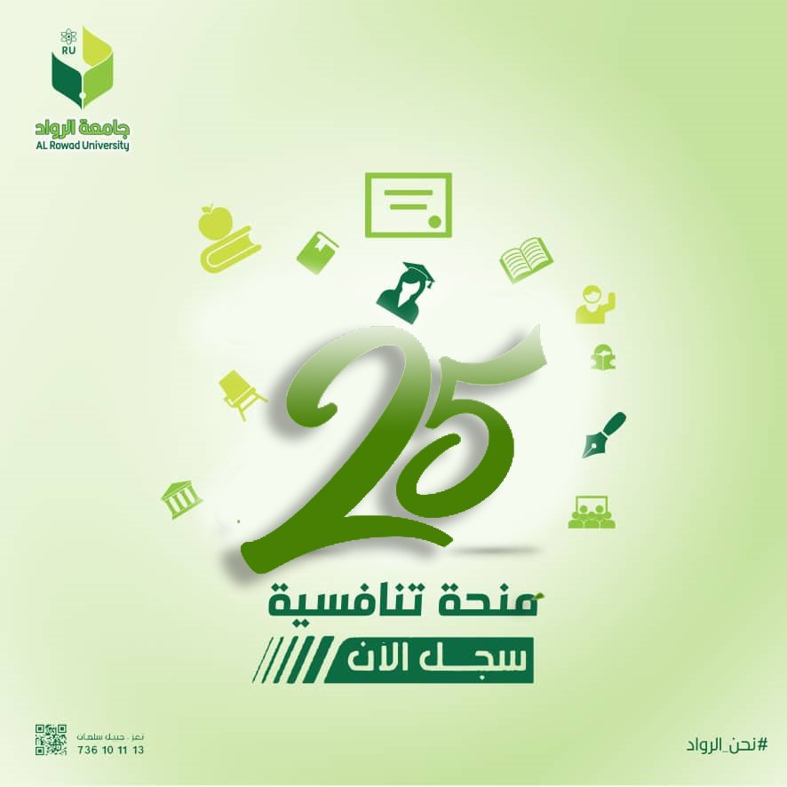 في إطار خدمه المجتمع والاهتمام بالمتميزين تُعلن جامعة الرواد عن فتح باب التسجيل لبرنامج المنح السنوية التنافسية، حيث توفر (25 منحة) دراسية كاملة وجزئية في مختلف التخصصات.